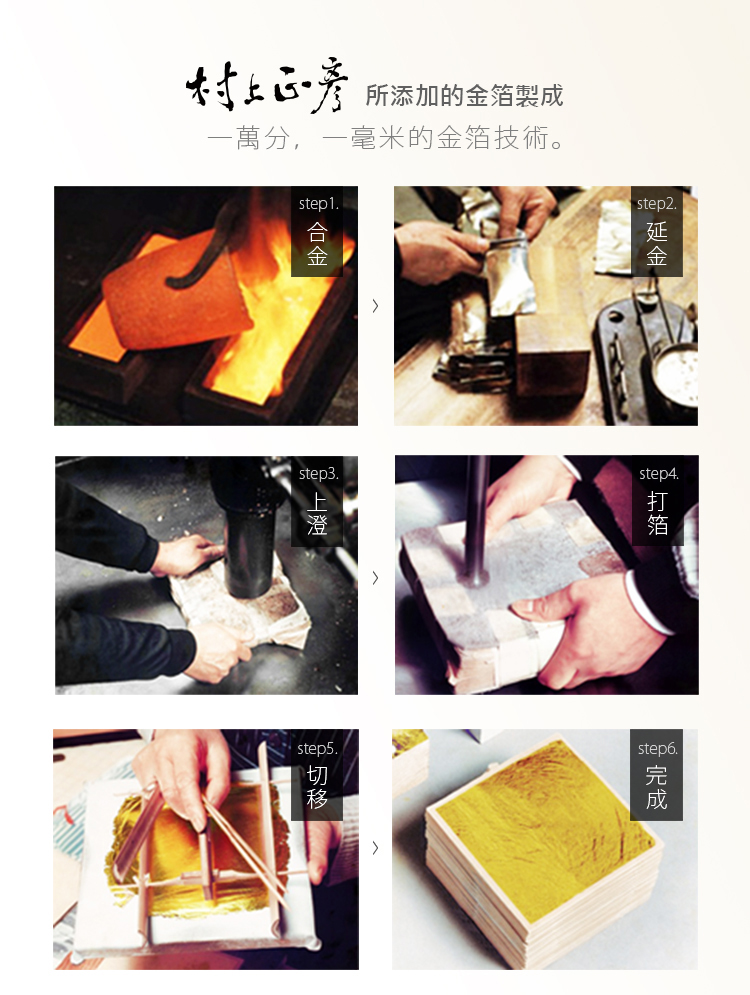 ※村上正彥使用的金箔是完全不含不純雜質的食用級金箔,完全可以安全無慮使用的高級金箔,且經過手掌指腹輕抹就能迅速化開,被肌膚完全吸收。