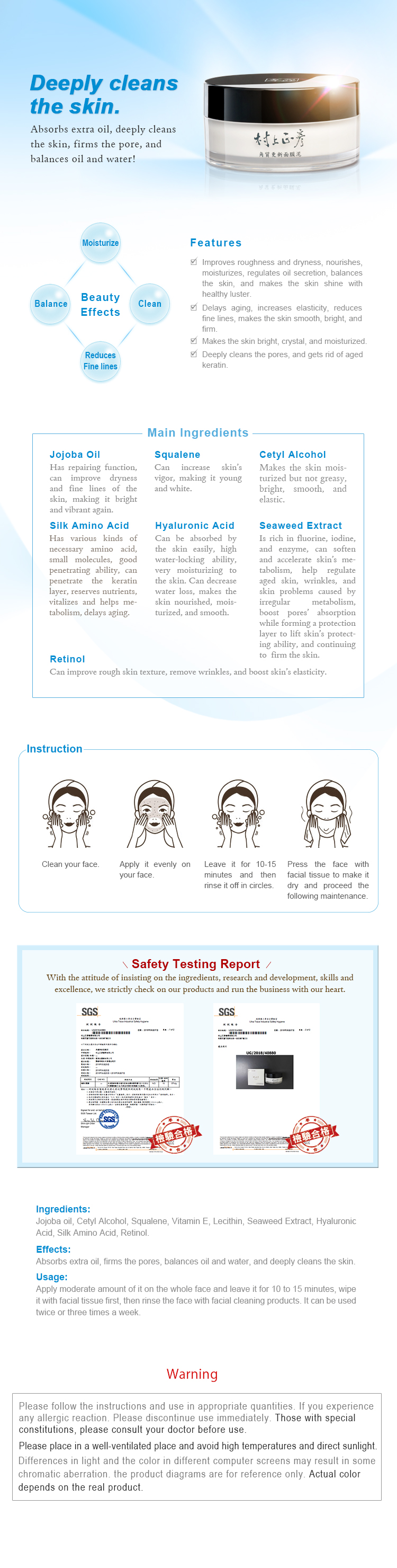 - Improves roughness and dryness, nourishes, moisturizes, regulates oil secretion, balances the skin, and makes the skin shine with healthy luster