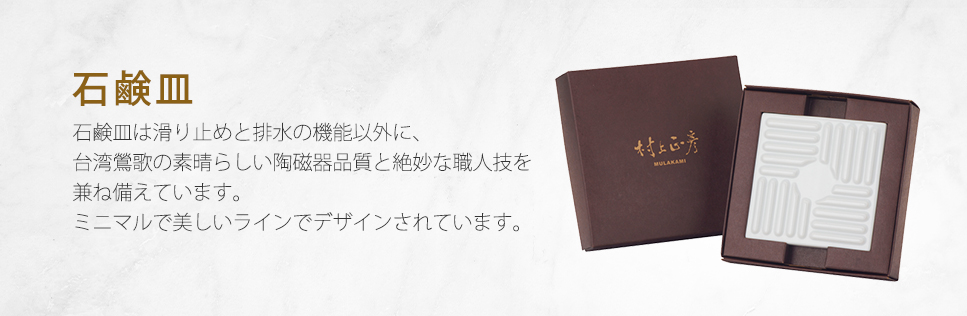 村上正彦さんの札建箱のデザインは、石鹸容器に必要なすべり止めや水たまり機能だけではなく、台湾ならではの鶯歌の優れた陶器品質と上品で手の込んだ芸術を取り入れることによって、シンプルかつ美しい輪郭線を伴ったデザインに出来上がっています。もっとも簡単で洗練された輪郭線の伴う石鹸箱を通して、「村上正彥」の品質は「石鹸」と「箱」の間の相互依存性と相互の達成感を完璧に表現しており、村上正彦の石鹸箱は独特な使命感を創り出しています。