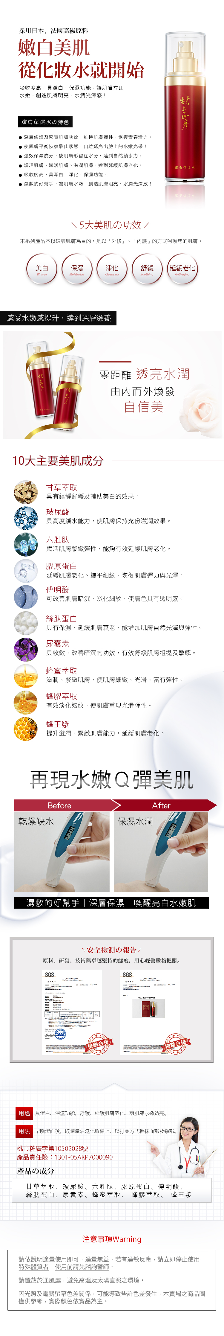 深層修護肌膚及角質強化功效,改善肌膚活力、恢復青春彈力。 使肌膚平衡恢復最佳狀態,自然透亮出臉上的水嫩光采! 強效保濕成分深入肌層,使肌膚形成自然鎖水力。 吸收度高,具潔白、淨化、保濕功能。 濕敷的好幫手。讓肌膚水嫩,創造肌膚明亮、水潤光澤感!