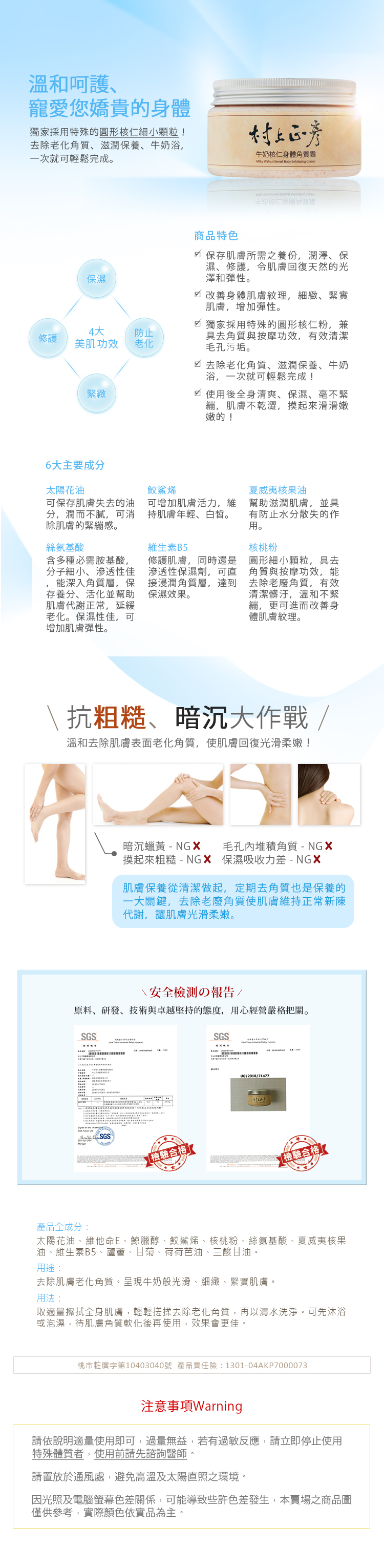 獨家採用特殊的圓形核仁細小顆粒!促進角質更新代謝,滋潤保養、牛奶浴,一次就可輕鬆完成! 保存肌膚所需之養份,潤澤、保濕、修護,令肌膚回復天然的光澤和彈性。 改善身體肌膚紋理,細緻、緊實肌膚,增加彈性。 使用後全身清爽、保濕、毫不緊繃,肌膚不乾澀,摸起來滑滑嫩嫩的!