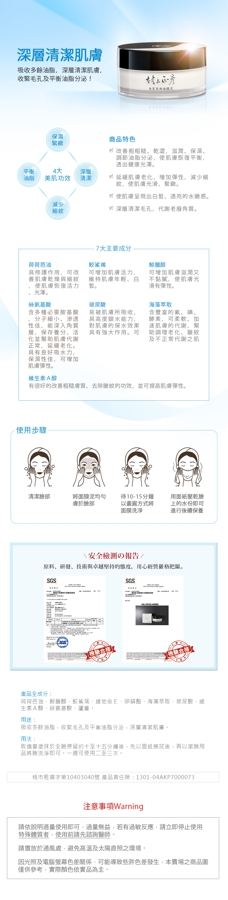 去除多餘油脂,深層清潔肌膚,緊緻毛孔及平衡油脂分泌!